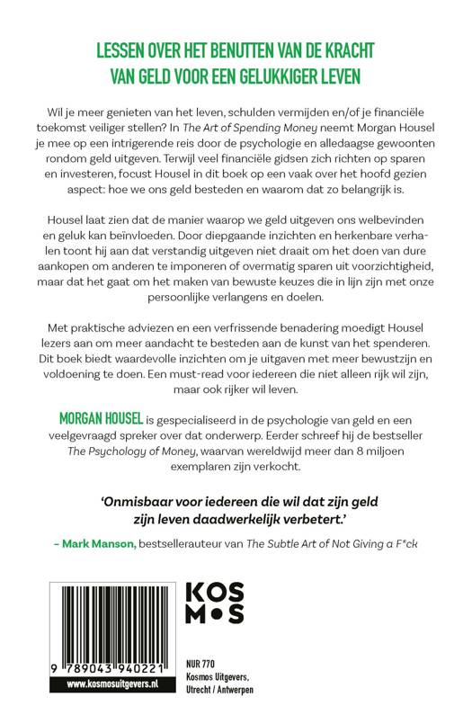 Morgan Housel is gespecialiseerd in de psychologie van geld. Zijn boeken hebben miljoenen mensen geholpen opnieuw na te denken over hoe ze verdienen, sparen en investeren. Nu richt hij zijn aandacht op het uitgeven van geld. Met inzicht, humor en warmte laat hij zien waarom het meest waardevolle rendement op investering gemoedsrust is, waarom goede vooruitzichten er meer toe doen dan inkomen en waarom goed omgaan met geld minder te maken heeft met spreadsheets en meer met zelfbewustzijn.