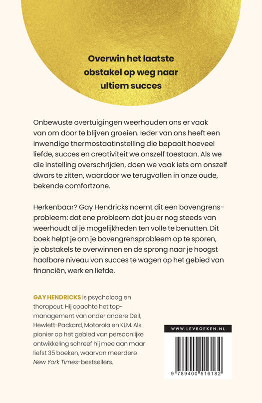 Onbewuste overtuigingen weerhouden ons er vaak van om door te blijven groeien. We denken bijvoorbeeld: ‘Je kunt niet altijd succesvol zijn’, ‘Mijn collega’s vinden me vast niet meer aardig als ik voor die promotie ga’ of ‘Ik kan niet te lang gelukkig zijn, dan gaat er vast weer iets mis’. Herkenbaar? Gay Hendricks noemt dit een upper limit problem, een negatief gevoel dat ons bekruipt wanneer er iets positiefs in ons leven gebeurt. Dit boek helpt je om dit patroon te doorbreken, jouw eigen upper limit problem op te lossen en de sprong naar je hoogst haalbare niveau van succes te wagen. Dit boek helpt je niet alleen te groeien op financieel gebied, maar ook in de liefde en het leven in het algemeen.