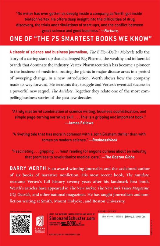 Join journalist Barry Werth as he pulls back the curtain on Vertex, a start-up pharmaceutical company, and witness firsthand the intense drama being played out in the pioneering and hugely profitable field of drug research.Founded by Joshua Boger, a dynamic Harvard- and Merck-trained scientific whiz kid, Vertex is dedicated to designing--atom by atom--both a new life-saving immunosuppressant drug, and a drug to combat the virus that causes AIDS. You will be hooked from start to finish, as you go from the labs, where obsessive, fiercely competitive scientists struggle for a breakthrough, to Wall Street, where the wheeling and dealing takes on a life of its own, as Boger courts investors and finally decides to take Vertex public. Here is a fascinating no-holds-barred account of the business of science, which includes an updated epilogue about the most recent developments in the quest for a drug to cure AIDS.
