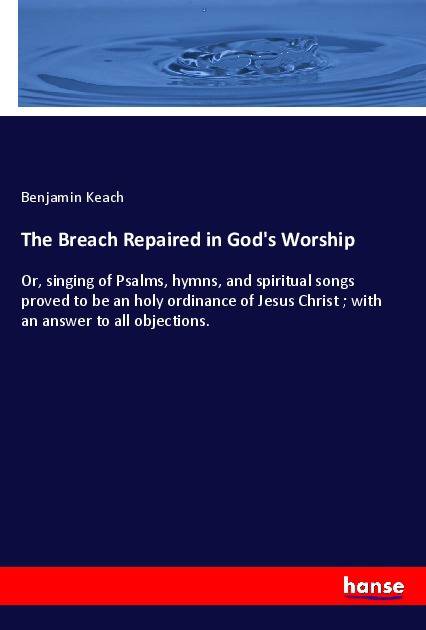 The Breach Repaired in God's Worship - Or, singing of Psalms, hymns, and spiritual songs proved to be an holy ordinance of Jesus Christ ; with an answer to all objections. is an unchanged, high-quality reprint of the original edition of 1691. Hansebooks is editor of the literature on different topic areas such as research and science, travel and expeditions, cooking and nutrition, medicine, and other genres. As a publisher we focus on the preservation of historical literature. Many works of historical writers and scientists are available today as antiques only. Hansebooks newly publishes these books and contributes to the preservation of literature which has become rare and historical knowledge for the future.