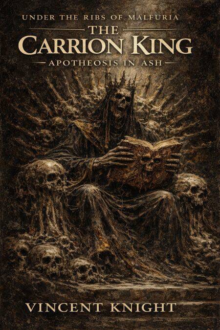 The universe is not merely indifferent; it is a rotting god. Long before the first spark of mortal thought ignited in the primordial dark, the Great Malfurian fell—dissected by cosmic rivals and left to drift as a celestial corpse in the cold, uncaring void. We do not inhabit a planet; we inhabit an anatomy. In The Carrion King: Apotheosis in Ash, the opening chronicle of the Under the Ribs of Malfuria series, Vincent Knight reveals the rhythmic, wet horror of a world that is actively decomposing. Here, the ivory mountains are the calcified ribs of a fallen titan, the soil is the nutrient-dense mulch of divine rot, and the very oceans are the clotting tides of a heart that refuses to stop beating. This is the story of Abduhazim, a prince born with the frantic, short-lived fever of humanity, who dared to reach into a swamp-drowned dungeon and pull forth a testament bound in flayed skin. It is a chronicle of anatomical heresy, documenting a man's descent from greedy exile to the Architect of a million-man army of the damned. As the twin moons Ishna and Rashna reach their zenith, a ritual of mass sacrifice will turn a kingdom into a necropolis and a prince into a god of ash. In this beautiful, terrifying ossuary, magic is a parasitic infection and ambition is a death sentence. The ink is reeled from human nerves to record the final accounting of a reality that was never meant to survive its own birth. Step beneath the ribs of Malfuria and witness the glory of the end. The God is silent. The maggots are hungry. And the King is finally ready to dance.