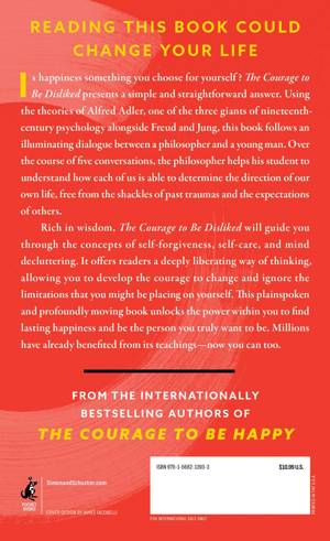 An international bestseller and TikTok sensation with more than 10 million copies sold worldwide, The Courage to Be Disliked is a transformative and practical guide to personal happiness and self-fulfillment.Now you can unlock your full potential and free yourself from the shackles of past traumas and societal expectations to find true personal happiness. Based on the theories of renowned psychologist Alfred Adler, this book guides you through the principles of self-forgiveness, self-care, and mind decluttering in a straightforward, easy-to-digest style that's accessible to all.The Courage to Be Disliked unfolds as a dialogue between a philosopher and a young man, who, over the course of five enriching conversations, realizes that each of us is in control of our life's direction, independent of past burdens and expectations of others. Wise, empowering, and profoundly liberating, this book is a life-changing experience that shows you a path to lasting happiness and how to finally be the person you truly want to be. Millions are already benefiting from its teachings--and you can be next.