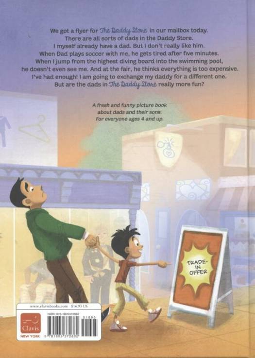 We got a flyer for the Daddy Store in our mailbox today. There are all sorts of dads in the Daddy Store. I myself already have a dad. But I don't really like him. When Dad plays soccer with me, he gets tired after five minutes. When I jump from the highest diving board into the swimming pool, he doesn't even see me. And at the fair, he thinks everything is too expensive. I've had enough! I am going to exchange my daddy for a different one. But are the dads in the Daddy Store really more fun?