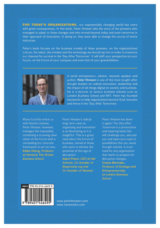 For today's organizations, our exponentially changing world has come with great consequences. In this book, Peter Hinssen tells the story of the pioneers who managed to adapt to those changes and who moved beyond today and even tomorrow in their approach of innovation. In doing so, they were able to change the course of entire industries. Peter's book focuses on the business models of these pioneers, on the organizational culture, the talent, the mindset and the technology we should tap into in order to maximize our chances for survival in the 'Day After Tomorrow'. It will shift your perspective on your future, on the future or your company and even that of your grandchildren.