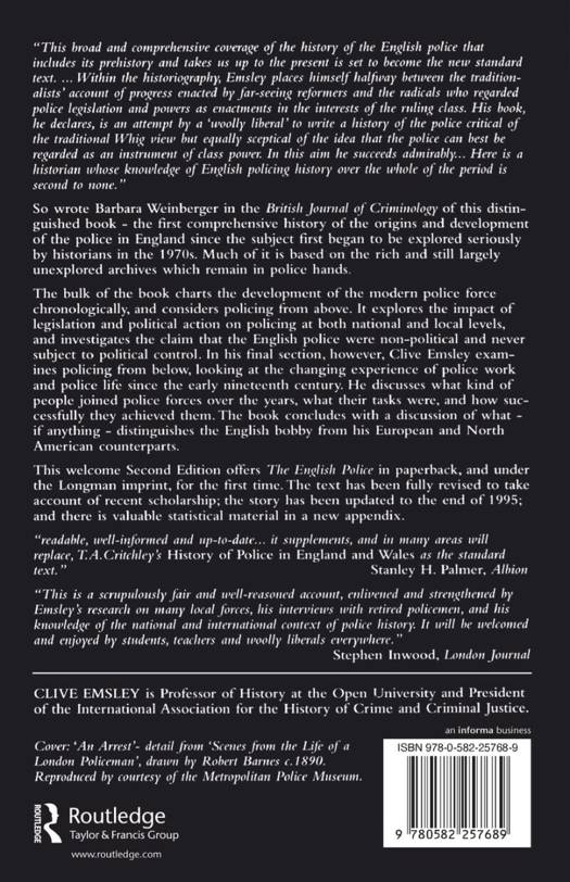 A comprehensive history of policing from the eighteenth century onwards, which draws on largely unused police archives. Clive Emsley addresses all the major issues of debate; he explores the impact of legislation and policy at both national and local levels, and considers the claim that the English police were non-political and free from political control. In the final section, he looks at the changing experience of police life. Established as a standard introduction to the subject on its first appearance, the Second Edition has been substantially revised.