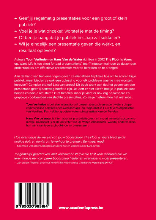Auteurs Toon Verlinden en Hans Van de Water richtten in 2012 The Floor is Yours op. Want 'Life is too short for bad presentations', toch? Intussen trainden ze duizenden onderzoekers om effectieve presentaties voor te bereiden en te brengen.