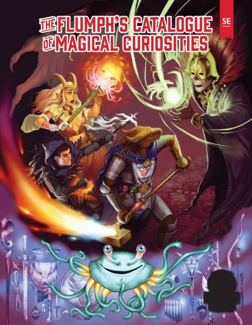 Make Your 5E Game More Magical! The Flumph's Catalogue of Magical Curiosities includes 300+ all new magic items ready to use in your 5E game. There are potions, scrolls, magical weapons, rings, rods, staves, wands, and of course wondrous items. All rarities are represented, including a selection of artifacts complete with compelling backstories. Plus, pages of tables featuring magic items sorted by type and rarity, as well as tables to randomly determine magic items in hoards. Narrated by our own flumph, each item includes this curious creature's musings on the item's history, discovery, or experimental use. Here are a few examples: - Displacer Knife - Steadfast Helm - Box of Many Things - Wailing Flail - Bag of Cats - Cloak of Shadow Weaving - Axe of Betrayal - Key to the City Tired of giving out +1 longswords after a climactic battle with the Big Bad on level 4? Give your players one of these magic items!