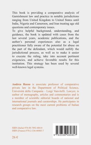 This book is providing a comparative analysis of Garnishment law and practice in notable jurisdictions ranging from United Kingdom to United States until India, Nigeria and Cameroon, and Iran treating age old questions and contemporary issues. To give helpful background, understanding, and guidance, the book is updated with cases from the last several years, academic publications, and the author's personal experiences also as a legal practitioner fully aware of the potential for abuse on the part of the defendant, which would nullify the jurisdictional process, as well as to make it easier to execute the ruling, take into account pertinent exigencies, and achieve favorable results for this institution. This strategy has been used by several well-known legal systems.