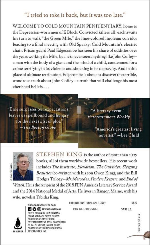 Welcome to Cold Mountain Penitentiary, home to the Depression-worn men of E Block. Convicted killers all, each awaits his turn to walk “the Green Mile,” the lime-colored linoleum corridor leading to a final meeting with Old Sparky, Cold Mountain’s electric chair. Prison guard Paul Edgecombe has seen his share of oddities over the years working the Mile, but he’s never seen anything like John Coffey—a man with the body of a giant and the mind of a child, condemned for a crime terrifying in its violence and shocking in its depravity. And in this place of ultimate retribution, Edgecombe is about to discover the terrible, wondrous truth about John Coffey—a truth that will challenge his most cherished beliefs…