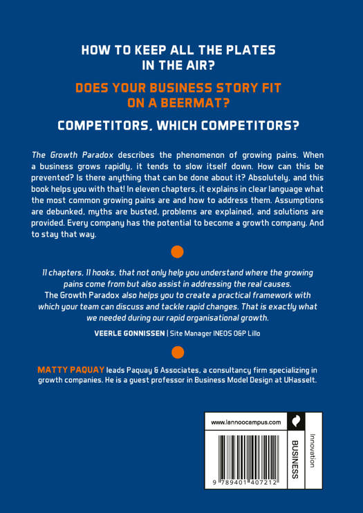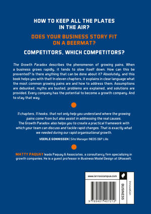 The Growth Paradox describes the phenomenon of growing pains. When a business grows rapidly, it tends to slow itself down. How can this be prevented? Is there anything that can be done about it? Absolutely, and this book helps you with that! In 11 chapters, it explains in clear language what the most common growing pains are and how to address them. Assumptions are debunked, myths are busted, problems are explained, and solutions are provided. Every company has the potential to become a growth company. And to stay that way.