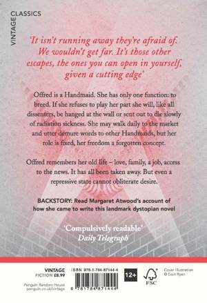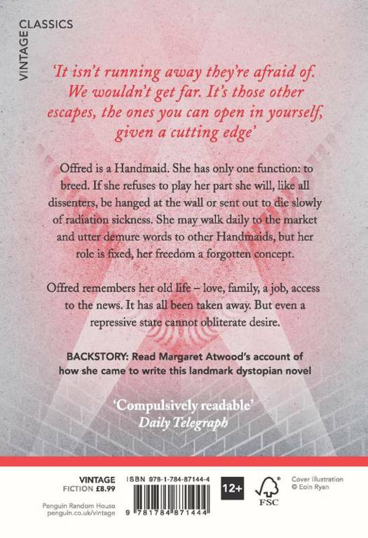 Offred is a Handmaid. She has only one function: to breed. If she refuses to play her part she will, like all dissenters, be hanged at the wall or sent out to die slowly of radiation sickness. She may walk daily to the market and utter demure words to other Handmaid's, but her role is fixed, her freedom a forgotten concept.