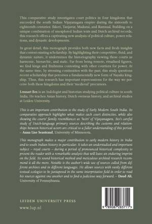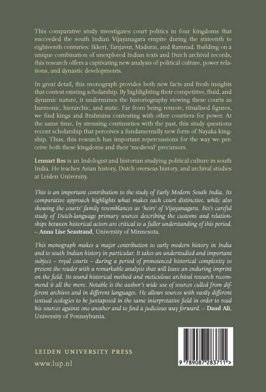 "This comparative study investigates court politics in four kingdoms that succeeded the s outh Indian Vijayanagara empire during the sixteenth to eighteenth centuries: Ikkeri, Tanjavur, Madurai, and Ramnad. Building on a unique combination of unexplored Indian texts and Dutch archival records, this research offers a captivating new analysis of political culture, power relations, and dynastic developments. In great detail, this monograph provides both new facts and fresh insights that contest existing scholarship. By highlighting their competitive, fluid, and dynamic nature, it undermines the historiography viewing these courts as harmonic, hierarchic, and static. Far from being remote, ritualised figures, we find kings and Brahmins contesting with other courtiers for power. At the same time, by stressing continuities with the past, this study questions recent scholarship that perceives a fundamentally new form of Nayaka kingship. Thus, this research has important repercussions for the way we perceive both these kingdoms and their 'medieval' precursors. "