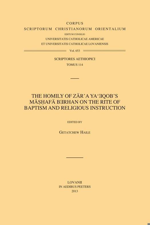 The text in this volume (with its translation) is from the writings of Emperor Zar'a Yaeqob, the prolific scholar who reformed the Ethiopian Orthodox Church in the fifteenth century. In this homily, which is part of his previously published Mashafa Berhan "Book of Light" (see CSCO vols. 250/Script. Aeth. 47 and 261/Script. Aeth. 51), he addresses in detail the ritual of Christian baptism and the requirement of religious instruction for the baptized faithful as well as the would-be baptized catechumens. The ritual for adults is discussed and defined with thoroughness and clarity not found in any other source. Significantly, the text suggests that there was at that time a large number of non-Christians who converted to Orthodox Christianity, either of their own free will or due to pressure from Christian rulers, including the Emperor. As always, Zar'a Yaeqob uses his authority to enforce religious instruction as he details it. He prescribes harsh corporal punishment, usually flogging, to individuals who do not attend school without acceptable excuses-which are illness and going on military expeditions- as well as to clergy who neglect their duty to teach and to district rulers who do not force people to come to school. A close study of the homily sheds some interesting light on the history of Ethiopic literature. For example, the extensive quotation from Acts is not from the text we now know. This detail corroborates what is known that the book was translated anew after the time of Zar'a Yaeqob. A second example is Zar'a Yaeqob's quotation of John Chrysostom. That he quotes from his homily in the Apophthegmata Patrum shows that this source was well known in Ethiopia prior to the fifteenth century.
