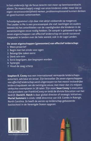 The Leader in Me is een procesaanpak gebaseerd op de zeven eigenschappen van effectief leiderschap en betrekt staf, leerlingen en ouders bij het ontwikkelen van de vaardigheden die kinderen in de eenentwintigste eeuw nodig hebben. In het onderwijs ligt de focus terecht niet meer op kennisoverdracht alleen. De maatschappij vraagt van onze kinderen onder meer dat ze eigen verantwoordelijkheid nemen, probleemoplossend kunnen denken en goed kunnen samenwerken. Schoolprogramma's zijn daar niet altijd voldoende op toegerust. Zeven gewoonten zorgen voor (persoonlijk) leiderschap bij leerlingen: 1. Wees proactief 2. Begin met het einde voor ogen 3. Belangrijke zaken eerst 4. Denk win-win 5. Eerst begrijpen, dan begrepen worden 6. Synergie 7. Houd de zaag scherp Stephen R. Covey was een internationaal vermaarde leiderschapsautoriteit, adviseur en leraar. Zijn bestseller De zeven eigenschappen van effectief leiderschap werd uitgeroepen tot het meest invloedrijke leiderschapsboek van de twintigste eeuw, met meer dan 25 miljoen verkochte exemplaren in 38 talen. Zijn zoon Sean Covey is executive vice president van FranklinCovey en leidt de divisie Education van het bedrijf. David K. Hatch is daar global director of strategic initiatives. Muriel Summers is sinds 1998 directrice van A.B. Combs in Raleigh, North Carolina. Ze heeft de eerste op leiderschap gebaseerde basisschool in de Verenigde Staten opgezet.