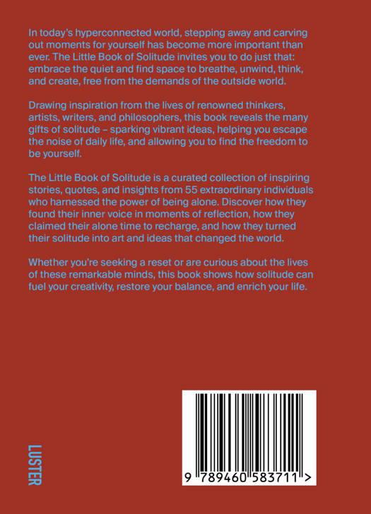 Inspired by the lives of great thinkers, artists, writers, and philosophers, photographer Joost Joossen explores the many benefits of solitude. The Little Book of Solitude is a carefully curated collection of inspiring stories, quotes, and insights from 55 extraordinary individuals who harnessed the power of solitude. Among them are Nelson Mandela, James Dean, Edward Hopper, Immanuel Kant, Marina Abramovic, Pina Bausch, David Lynch, Buddha, Frida Kahlo, Marcus Aurelius, and Marie Kondo.