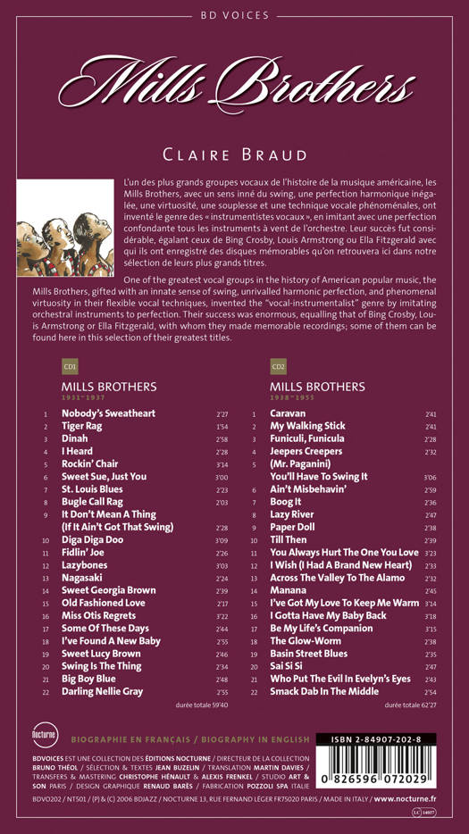 L’un des plus grands groupes vocaux de l’histoire de la musique<br /> américaine, les Mills Brothers, avec un sens inné du swing, une perfection<br /> harmonique inégalée, une virtuosité, une souplesse et une technique<br /> vocale phénoménales, ont inventé le genre des “instrumentistes vocaux“,<br /> en imitant avec une perfection confondante tous les instruments à vent de<br /> l’orchestre. Leur succès fut considérable, égalant ceux de Bing Crosby,<br /> Louis Armstrong ou Ella Fitzgerald avec qui ils ont enregistré desmémorables qu’on retrouvera ici dans notre sélection de leurs plutitres.<br />