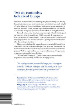 Financial Times The future is uncertain but for one thing: the global economy is in disarray. Investors, companies and governments must rethink their approach in light of raging inflation, the ongoing climate crisis and an ageing population. In addition, they have to deal with the highest mountain of debt ever accrued in peacetime, disruptive innovations and the effects of multi-globalization. So much is happening simultaneously, making it difficult to distinguish the big waves from the small hypes. Which economic developments are here to stay and which are transient? How will interest rates evolve? Which emerging countries will become tomorrow's global powers? Which sectors offer the most opportunities? Macroeconomist Koen De Leus and market strategist Philippe Gijsels take a deep dive into the inner workings of our economy. They identify the five major trends that will dominate our lives and our money over the next 30 years. With in-depth analyses and concrete advice, they offer guidance, reveal connections and temper alarmism.