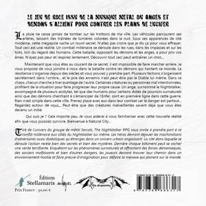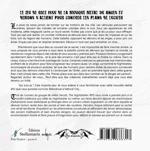 La pluie ne cesse jamais de tomber sur les trottoirs de ma ville. Les véhicules parcourent ses artères, laissant des traînées de lumières colorées dans la nuit. Sous ses apparences de cité moderne, cette mégapole cache un lourd secret. N’allez pas croire que je dis ça pour vous effrayer. Tout ceci est une réalité. Un combat millénaire se déroule dans les rues, dans les impasses et sur les toits, loin du regard des humains. Cette bataille, opposant les démons et les anges, a pour prix vos âmes. N’ayez pas peur et respirez lentement. Découvrir tout ceci peut entraîner un choc... Maintenant que vous êtes au courant de ce secret, il est impossible de faire marcher arrière. Je vous propose de vous joindre à nous dans la bataille contre les démons qui hantent ce monde. La résistance s’organise depuis des siècles et vous pouvez y prendre part. Plusieurs factions s’organisent secrètement dans l’ombre... et le pire des ennemis n’est peut-être pas le Diable lui-même. Dans ce chaos, chacun cherche à tirer avantage de l’autre. Certaines créatures ou personnes mal intentionnées, profitent de la situation pour faire progresser leur propre cause. Un ange, surnommé le Nightstalker, accompagné de plusieurs acolytes, tel que des humains pour certains dotés de pouvoirs surnaturels ainsi que des démons cherchant à s’émanciper de l’Enfer, sont en première ligne dans cette guerre. Rien n’est simple dans cette ville. Prenez place avec eux dans leur combat car le danger est partout... Regardez autour de vous... Peut-être que des créatures malveillantes savent déjà que vous êtes devenu un initié. Qui suis-je ? Cela importe peu. Je vous aiderai à vous familiariser avec cette nouvelle réalité afin que vous puissiez survivre. Bienvenue à Natural City... Tiré de l’univers du groupe de métal Sercati, The Nightstalker RPG vous invite à prendre part à ce conflit millénaire aux côtés du Nightstalker lui-même. Les héros devront déjouer les machinations d’adversaires aussi diaboliques qu’étranges dans un univers urbain angoissant. La cité dans laquelle se déroule l’action recèle bien des secrets et bien des mystères. Derrière chaque bâtiment peut se cacher une vérité terrifiante. Enquêtant sur les phénomènes surnaturels et affrontant des forces démoniaques, des sorciers malfaisants et bien d’autres dangers, les joueurs devront trouver leur chemin dans un environnement hostile et faire preuve d’imagination pour défaire la menace qui planent sur le monde.