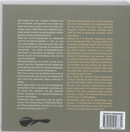 Alle liedjes met een vroegere vertolker dan de vertrouwde, weergegeven van oudste opname tot meest recente cover, dat is The Originals, sedert 1982 baken van muzikale informatie zonder weerga, zonder poespas, zonder grenzen, zonder genade (hoewel). Naast site (www.originals.be) en radioreeks (www.L1.nl/radio/originals) is hier nu ook een boek-update en werd dat geen tijd, volle 10 jaar na de vorige? Getuige de beduimelde exemplaren van zowel muziekprofessional (producent of recensent) als amateur (verzamelaar of juist niet verzamelaar). Hen hoef je niet te overtuigen. Referentiemateriaal, dat check je toch op internet? Laat The Originals wat dat betreft een uitzondering zijn. Door de omvang, diepgang, overzichtelijkheid en puur bladergenot. Hier kom je nog eens op ideeën mee en sla je betweterige kids mee om de oren telkens die weer eens een nabootser blijken achterna te hollen. Deze vijfde editie, voor het eerst Engelstalig, incorporeert alle onaangetaste informatie uit de vorige vier, waardoor die dus eigenlijk zonder verpinken in de papierversnipperaar kunnen. No kidding. Doelbewust geen illustraties; fuck de beeldcultuur. Pure content. Bijna 12.000 stuks. Waanzin? Wijlen Koko Taylor stelt het zo: "It's a dirty job but somebody's gotta do it."
