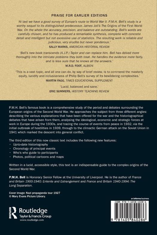 PMH Bell's famous book is a comprehensive study of the period and debates surrounding the European origins of the Second World War. He approaches the subject from three different angles: describing the various explanations that have been offered for the war and the historiographical debates that have arisen from them, analysing the ideological, economic and strategic forces at work in Europe during the 1930s, and tracing the course of events from peace in 1932, via the initial outbreak of hostilities in 1939, through to the climactic German attack on the Soviet Union in 1941 which marked the descent into general conflict.