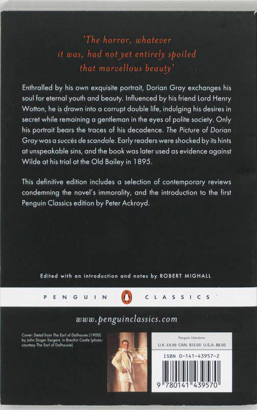 A knowing account of a secret life and an analysis of the darker side of late Victorian society. The Picture of Dorian Gray offers a disturbing portrait of an individual coming face to face with the reality of his soul. Shocking in its suggestion of unspeakable sin, this novel was later used as evidence against Wilde when he was tried for indecency in 1895.