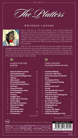 Grâce à "Only You" et "The Great Pretender", deux<br /> succès inoxydables, deux slows qui ont fait danser<br /> serrées plusieurs générations, les Platters constituent<br /> la formation vocale noir américaine la plus célèbre<br /> dans le monde. Formée à Los Angeles en 1953, puis<br /> pris en main par le manager Buck Ram, le groupe<br /> connaît un rapide succès et traverse cinq décennies.<br /> Buck Ram dirige l’entreprise « Platters » et traverse<br /> les changements de solistes et les vogues musicales,<br /> mais la mémoire retiendra les Platters comme le<br /> groupe qui a dominé les années cinquante