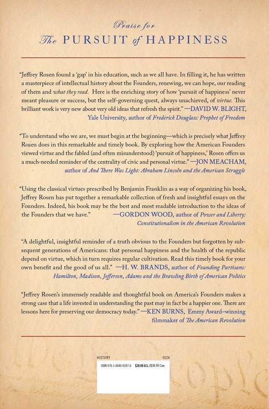 The Declaration of Independence identified "the pursuit of happiness" as one of our unalienable rights, along with life and liberty. Jeffrey Rosen, the president of the National Constitution Center, profiles six of the most influential founders--Benjamin Franklin, George Washington, John Adams, Thomas Jefferson, James Madison, and Alexander Hamilton--to show what pursuing happiness meant in their lives, and to give us the "best and most readable introduction to the ideas of the Founders that we have" (Gordon Wood, author of Power and Liberty).