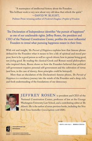 A New York Times bestseller and an "enriching...brilliant" (David W. Blight, Pulitzer Prize-winning author of Frederick Douglass) examination of what "the pursuit of happiness" meant to our nation's Founders and how that famous phrase defined their lives and became the foundation of our democracy.The Declaration of Independence identified "the pursuit of happiness" as one of our unalienable rights, along with life and liberty. Jeffrey Rosen, the president of the National Constitution Center, profiles six of the most influential founders--Benjamin Franklin, George Washington, John Adams, Thomas Jefferson, James Madison, and Alexander Hamilton--to show what pursuing happiness meant in their lives, and to give us the "best and most readable introduction to the ideas of the Founders that we have" (Gordon Wood, author of Power and Liberty). By reading the classical Greek and Roman moral philosophers who inspired the Founders, Rosen shows us how they understood the pursuit of happiness as a quest for being good, not feeling good--the pursuit of lifelong virtue, not short-term pleasure. Among those virtues were the habits of industry, temperance, moderation, and sincerity, which the Founders viewed as part of a daily struggle for self-improvement, character development, and calm self-mastery. They believed that political self-government required personal self-government. For all six Founders, the pursuit of virtue was incompatible with enslavement of African Americans, although the Virginians betrayed their own principles. "Immensely readable and thoughtful" (Ken Burns), The Pursuit of Happiness is more than an elucidation of the Declaration's famous phrase; it is a revelatory journey into the minds of the Founders, and a deep, rich, and fresh understanding of the foundation of our democracy.