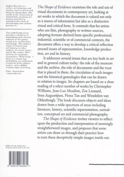 The first in Valiz's new vis-à-vis series of accessible introductions to academic subjects in contemporary art, architecture and design, The Shape of Evidence examines the use of the document in contemporary art, focusing on artworks in which the seemingly straightforward document is valued not only as a source of information but also as a distinctive visual and critical form. The author, Amsterdam-based art historian Sophie Berrebi, contends that for artists using filmed, photographic or written sources, the document can offer a way to develop a critical position on issues of representation, knowledge production, art and art history. Touching on several key issues in contemporary art--the trustworthiness of documents, the role of the museum and the archive--the author builds her argument through a close reading of select works of art by Christopher Williams, Fiona Tan, Zoe Leonard, Sven Augustÿnen, Wendelien van Oldenborgh and Jean-Luc Moulène, illustrated throughout the text.
