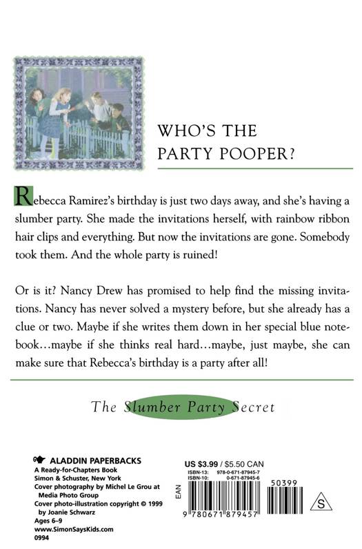 Rebecca Ramirez's birthday is just two days away, and she's having a slumber party. She made the invitations herself, with rainbow ribbon hair clips and everything. But now the invitations are gone. Somebody took them and the whole party is ruined. Or is it? Nancy Drew is on the case and maybe she can make sure Rebecca's birthday is a party after all!