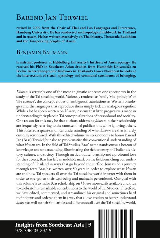 Khwan is certainly one of the most enigmatic concepts one encounters in the study of the Tai-speaking world. Variously rendered as 'soul', 'vital principle' or 'life essence', the concept eludes unambiguous translations as Western ontologies and the languages that reproduce them simply lack an analogous signifier. While a lot has been written on khwan, it seems that little progress was made in understanding their place in Tai conceptualizations of personhood and sociality. One reason for this may be that authors addressing khwan in their scholarship are frequently referring to the same seminal publications while ignoring others. This fostered a quasi-canonical understanding of what khwan are that is rarely critically scrutinized. With this edited volume we seek not only to honor Barend Jan (Baas) Terwiel, but also to problematize this conventional understanding of what khwan are. In the field of Tai Studies, Baas' name stands out as a beacon of knowledge and understanding, illuminating the rich tapestry of Thailand's history, culture, and society. Through meticulous scholarship and a profound love for the subject, Baas has left an indelible mark on the field, enriching our understanding of Thailand in ways that go beyond the surface. Join us on a journey through texts Baas has written over 50 years in order to explore what khwan are and how Tai-speakers all over the Tai-speaking world interact with them in order to strengthen their well-being and maintain personhood. Our goal with this volume is to make Baas scholarship on khwan more easily available and thus to celebrate his remarkable contributions to the world of Tai Studies. Therefore, we have edited, commented, and streamlined his original and sometimes hard to find texts and ordered them in a way that allows readers to better understand khwan as well as their similarities and differences all over the Tai-speaking world.ABOUT THE SERIESDevelopments in the field of area studies - goaded by the analytical deconstruction of world regions as such - have deeply affected the knowledge production on societies and cultures located in these politicized compartmentalization of the globe.With this series, the editors and authors wish to contribute to a reformulation of area studies that emphasizes the continuing epistemic value of contextualized knowledge production that is firmly rooted in concrete places.Starting with the notion of Southeast Asia, books published in this series will contribute to a more nuanced understanding of regionality based on a multidisciplinary approach.The series represents an oulet for young scholars intending to publish their degree theses and dissertations; and for established scholars who are looking for a place to republish out-of-print books, edited volumes or themed collections of their own papers and articles.We also invite scholarly collectives to publish collaborative works or edited volumes on topics that usually will not attract the attention of big presses due to their transdisciplinary orientation or the niche character of their topic.Our overall motivation is to maintain Southeast Asian studies as a critical and self-reflexive academic field.EDITORIAL BOARDDr. Benjamin Baumann, Chief EditorPD Dr. Daniel BultmannProf. Caroline S. HauProf. Vincent HoubenProf. Peter A. JacksonProf. Guido SprengerProf. Barend Jan TerwielDr. Xue Li
