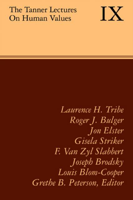 The Tanner Lectures on Human Values is the annual publication of the Tanner lectures given at Clare Hall, Cambridge University; Brasenose College, Oxford University; Harvard University; Yale University, the University of California; Stanford University, the University of Michigan; and the University of Utah and other locations. Established to reflect upon the scholarly and scientific learning relating to human values, the lectureships are international and intercultural and transcend ethnic, national, religious, and ideological distinctions. Volume IX includes: LAURENCE H. TRIBE 'On Reading the Constitution'; ROGER J. BULGER 'On Hippocrates, Thomas Jefferson and Weber: The Bureaucratic, Technologic Imperatives and the Future of the Healing Tradition in a Voluntary Society'; JON ELSTER 'Taming Chance: Randomization in Individual and Social Decisions'; GISELA STRIKER 'Greek Ethics and Moral Theory'; F. VAN ZYL SLABBERT 'The Dynamics of Reform and Revolt in Current South Africa'; JOSEPH BRODSKY 'A Place as Good as Any'; LOUIS BLOM-cOOPER 'The Penalty of Imprisonment'.