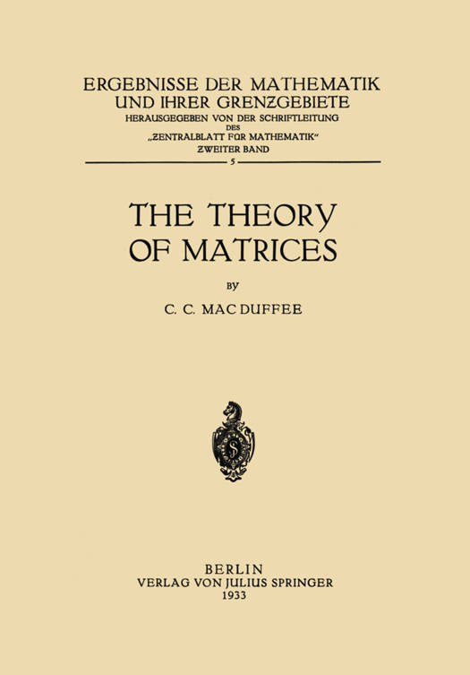 Matric algebra is a mathematical abstraction underlying many seemingly diverse theories. Thus bilinear and quadratic forms, linear associative algebra (hypercomplex systems), linear homogeneous trans- formations and linear vector functions are various manifestations of matric algebra. Other branches of mathematics as number theory, differential and integral equations, continued fractions, projective geometry etc. make use of certain portions of this subject. Indeed, many of the fundamental properties of matrices were first discovered in the notation of a particular application, and not until much later re- cognized in their generality. It was not possible within the scope of this book to give a completely detailed account of matric theory, nor is it intended to make it an authoritative history of the subject. It has been the desire of the writer to point out the various directions in which the theory leads so that the reader may in a general way see its extent. While some attempt has been made to unify certain parts of the theory, in general the material has been taken as it was found in the literature, the topics discussed in detail being those in which extensive research has taken place. For most of the important theorems a brief and elegant proof has sooner or later been found. It is hoped that most of these have been incorporated in the text, and that the reader will derive as much plea- sure from reading them as did the writer.