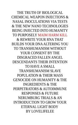 Biological Chemical Injections known as vaccines the truth of this eugenics programs agenda, the ingredients put in vaccines and the reactions the biological avatar body has when these chemical warfare weapons are delivered by injections, the autoimmune system response, and the new BIOLOGICAL NANO TECHNOLOGIES CHEMICAL WEAPONS INJECTIONS to GENOCIDE HUMANITY, BY RE WRITING THE RNA that builds the DNA with NO OFF SWITCH, this is to KILL as many as possible on earth & CONTROL the survivors via NANO TECHNOLOGIES injected into your biological avatar bodies, This means you after the new vaccine will no longer be of the original human DNA gene pool, and an introduction to the DNA blueprint of instructions to grow a light body.