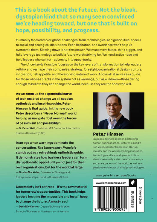 As we zoom up the exponential curve of tech enabled change we all need an optimistic and inspiring guide. Peter Hinssen is that guide. In this new book Peter describes a "Never Normal" world helping us navigate "between the forces of pessimism and possibility".
