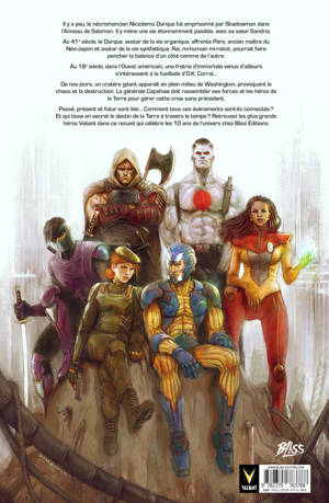 Il y a peu, le nécromancien Nicodemo Darque fut emprisonné par Shadowman dans l'Anneau de Salomon. Il y mène une vie étonnamment paisible, avec sa sÅur Sandria. Au 41e siècle, le Darque, avatar de la vie organique, affronte Père, ancien maître du Néo-Japon et avatar de la vie synthétique. Rai, mi-humain mi-robot, pourrait faire pencher la balance d'un côté comme de l'autre. Au 19e siècle, dans l'Ouest américain, une fratrie d'immortels venus d'ailleurs s'intéressent à la fusillade d'O.K. Corral⦠De nos jours, un cratère géant apparaît en plein milieu de Washington, provoquant le chaos et la destruction. La générale Capshaw doit rassembler ses forces et les héros de la Terre pour gérer cette crise sans précédent. Passé, présent et futur sont liés⦠Comment tous ces évènements sont-ils connectésâ? Et qui tisse en secret le destin de la Terre à travers le tempsâ? Retrouvez les plus grands héros Valiant dans ce recueil qui célèbre les 10 ans de l'univers chez Bliss Éditions.