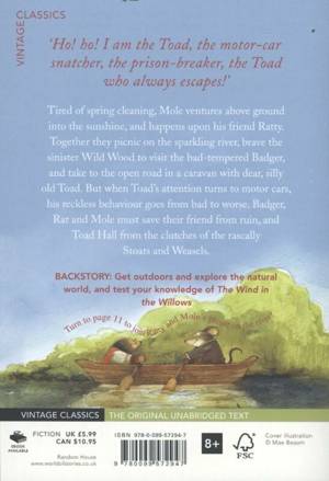 Tired of spring cleaning, Mole ventures above ground into the warm sunshine, and happens upon his friend Ratty. Together they picnic on the sparkling, burbling river, brave the sinister Wild Wood in wintertime to visit the bad-tempered Badger, and take to the open road in a caravan with dear, silly old Toad. But when Toad's attention turns to motor cars, his reckless behavior goes from bad to worse. Badger, Rat, and Mole must save their friend from ruin, and Toad Hall from the clutches of the rascally Stoats and Weasels.