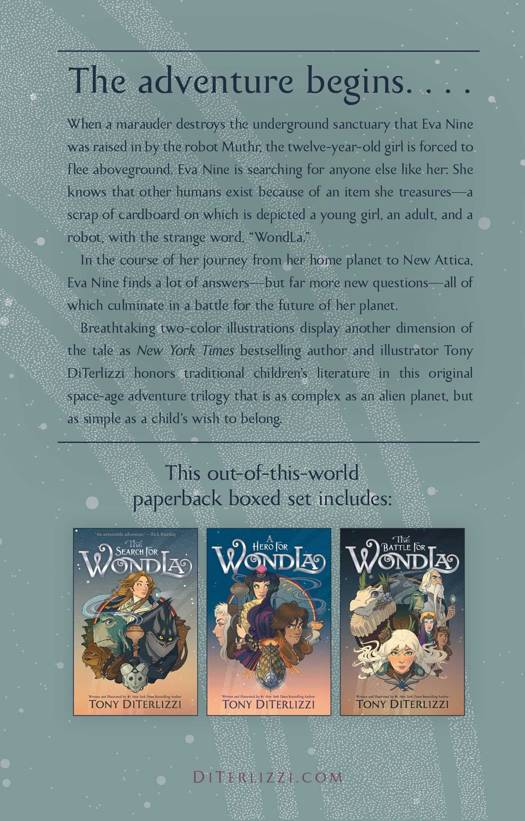 Celebrate the 10th anniversary of Tony DiTerlizzi's New York Times bestselling, richly illustrated The Search for Wondla series with this collectible paperback boxed set of the modern classic space-age adventures featuring an all-new look. When a marauder destroys the underground sanctuary that Eva Nine was raised in by the robot Muthr, the twelve-year-old girl is forced to flee aboveground. Eva Nine is searching for anyone else like her: She knows that other humans exist because of an item she treasures--a scrap of cardboard on which is depicted a young girl, an adult, and a robot, with the strange word, "WondLa." Can she find where she belongs?