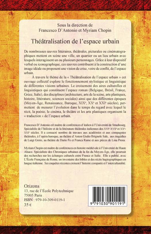 A travers le thème de la « théâtralisation de l'espace urbain » cet ouvrage collectif explore le fonctionnement stylistique et linguistique de différentes visions urbaines. Le croisement des aires culturelles et linguistiques qui constituent l'espace roman, des disciplines ainsi que des différentes époques (Moyen-Âge, Renaissance, Baroque, XIXe, XXe et XXIe siècles), permettent de mesurer l'évolution dans le temps du regard avec lequel le récit, la poésie, le cinéma, le théâtre et les arts plastiques organisent la « traduction » de l'espace urbain.