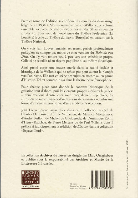 Ce premier tome de l’édition compte six pièces écrites du début des années 1960 au milieu des années 1970. Elles vont de l’expérience du Théâtre Prolétarien (la Louvière) à celle du Théâtre du Parvis (Bruxelles) en passant par le Théâtre National (Bruxelles). Avec un index des noms et un appareil de notes tant culturelles qu’historiques établi en concertation avec l’auteur.