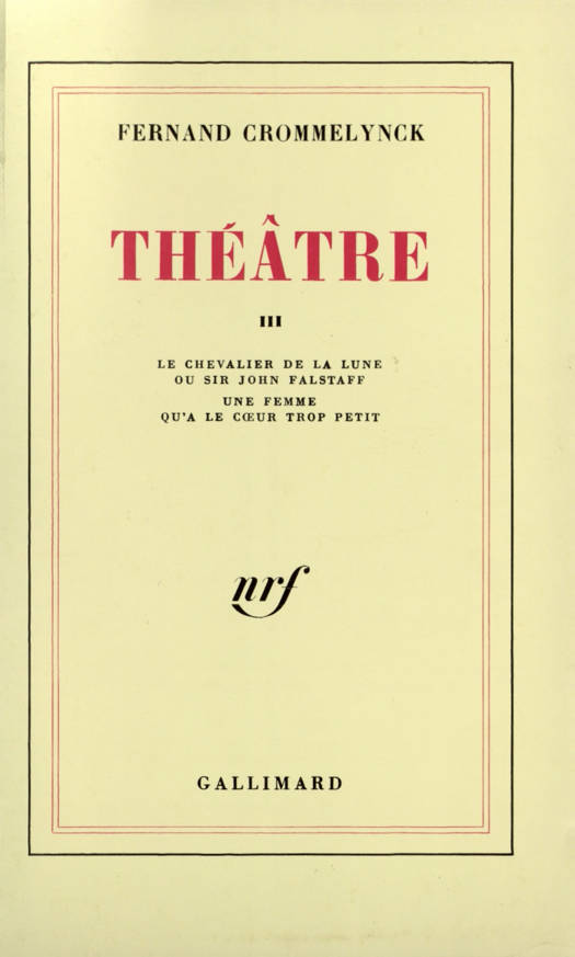 Deux pièces figurent dans ce volume : I. Le Chevalier de la Lune ou Sir John Falstaff, comédie en cinq actes "restituée, écrit l'auteur, en sa forme originale et précédée d'un argument". Après avoir longtemps étudié le Falstaff de Shakespeare ainsi que les nombreux documents historiques prétendant que cette oeuvre hybride fut la combinaison d'une tragédie et d'une farce, Crommelynck cherche à prouver cette théorie en dégageant la farce dont la continuité et l'homogénéité lui semblent incontestables. II. Une femme qu'a le coeur trop petit : sa création eut lieu à Bruxelles au Palais des Beaux-Arts le 11 janvier 1934 et à Paris au Théâtre de l'Œuvre le 15 janvier 1934. Le thème du drame est celui de la femme refoulée qui, redoutant et haïssant l'amour, s'en protège par le biais d'une maladie cardiaque. Olivier, l'époux d'abord mystifié et soumis, finira par la guérir de sa névrose en lui imposant sa force virile.