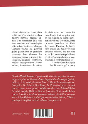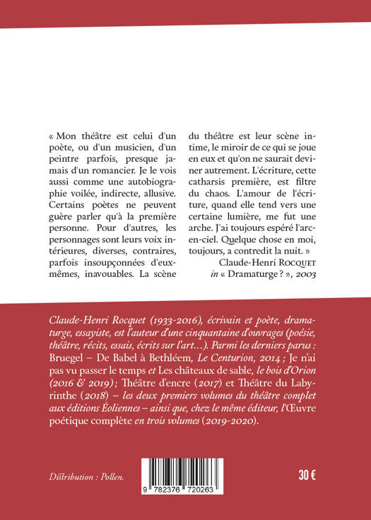"Mon théâtre est celui d'un poète, ou d'un musicien, d'un peintre parfois, presque jamais d'un romancier. Je le vois aussi comme une autobiographie voilée, indirecte, allusive. Certains poètes ne peuvent guère parler qu'à la première personne. Pour d'autres, les personnages sont leurs voix intérieures, diverses, contraires, parfois insoupçonnées d'eux-mêmes, inavouables. La scène du théâtre est leur scène intime, le miroir de ce qui se joue en eux et qu'on ne saurait deviner autrement. L'écriture, cette catharsis première, est filtre du chaos. L'amour de l'écriture, quand elle tend vers une certaine lumière, me fut une arche. J'ai toujours espéré l'arc-en-ciel. Quelque chose en moi, toujours, a contredit la nuit." Claude-Henri Rocquet in "Dramaturgeâ?", 2003 Ce troisième volume comporte : Noé, Babel, Babylone, parade, Chronique du déluge, Apocatastase, Jonas, Rahab, Jessica, Judith, Lucernaire, Hérode, Frères humains.