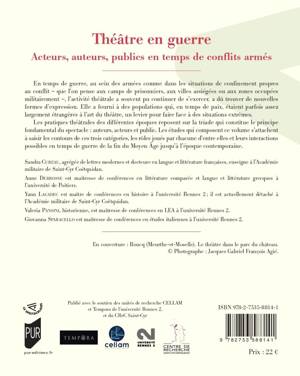 Les pratiques théâtrales des différentes époques reposent sur la triade qui constitue le principe fondamental du spectacle : auteurs, acteurs et public. Les études qui composent ce volume s’attachent à saisir les contours de ces trois catégories, les rôles joués par chacune d’entre elles et leurs interactions possibles en temps de guerre de la fin du Moyen Âge jusqu’à l’époque contemporaine.