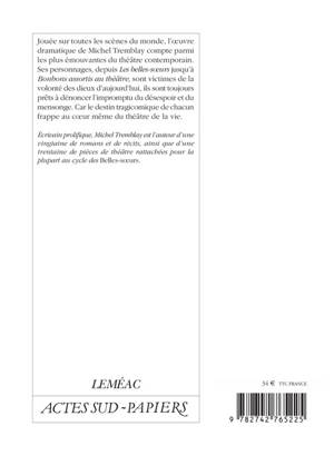 Jouée sur toutes les scènes du monde, l'oeuvre dramatique de Michel Tremblay compte parmi les plus émouvantes du théâtre contemporain. Ses personnages, depuis «Les belles-soeurs» jusqu'à «Bonbons assortis au théâtre», sont victimes de la volonté des dieux d'aujourd'hui, ils sont toujours prêts à dénoncer l'impromptu du désespoir et du' mensonge. Car le destin tragicomique de chacun frappe au coeur même du théâtre de la vie.