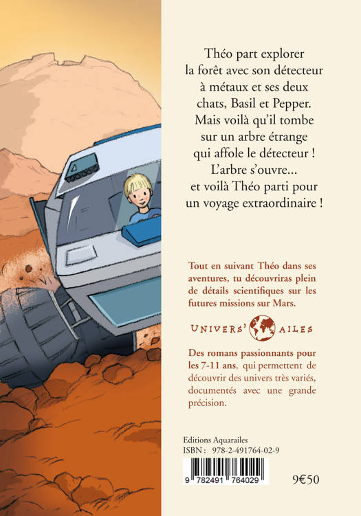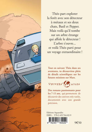 Théo part explorer la forêt avec son détecteur à métaux et ses deux chats, Basil et Pepper. Mais voilà qu'il tombe sur un arbre étrange qui affole le détecteur ! L'arbre s'ouvre… et voilà Théo parti pour un voyage extraordinaire ! Tout en suivant Théo dans ses aventures, le lecteur découvrira plein de détails scientifiques sur les futures missions sur Mars. Mes petits romans Univers'ailes, des romans passionants pour les 7-11 ans, qui permettent de découvrir des univers très variés, documentés avec une grande précision !