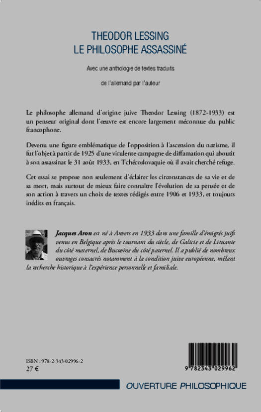 Devenu une figure emblématique de l'opposition à l'ascension du nazisme, Theodor Lessing (1872-1933) - philosophe allemand d'origine juive - fut l'objet à partir de 1925 d'une virulente campagne de diffamation qui aboutit à son assassinat le 31 août 1933. Cet essai se propose non seulement d'éclairer les circonstances de sa vie et de sa mort, mais surtout de mieux faire connaître l'évolution de sa pensée et de son action à travers un choix de textes rédigés entre 1906 et 1933, et toujours inédits en français.