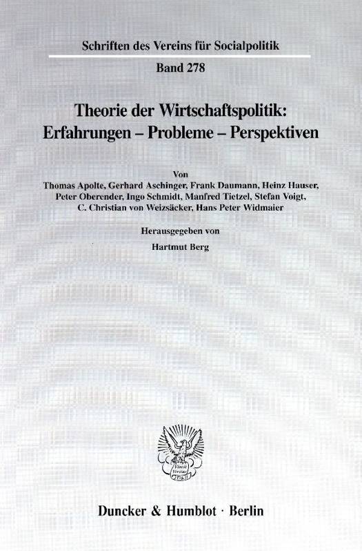 In der Regel behandelt der Wirtschaftspolitische Ausschuß des Vereins für Socialpolitik im Rahmen seiner Jahrestagungen Themen, die Relevanz wesentlich durch ihre Aktualität erhalten. Diese Praxis schließt indes nicht aus, daß immer wieder einmal auch grundsätzliche Probleme der Wirtschaftspolitik diskutiert werden. Belegt wird diese Tradition etwa durch die Veröffentlichung zur Jahrestagung 1970 (Dürr, E., Hrsg., Neue Wege der Wirtschaftspolitik, Schriften des Vereins für Socialpolitik, Neue Folge, Bd. 67) und durch die Publikation zur Jahrestagung 1981 (Woll, A., Hrsg., Aktuelle Wege der Wirtschaftspolitik, Schriften des Vereins für Socialpolitik, Neue Folge, Bd. 130). Auch die Jahrestagung, die vom 28. bis 30. März 2000 in Potsdam stattfand, hatte grundsätzliche Probleme der Theorie der Wirtschaftspolitik zum Gegenstand. Die dazu vorgelegten Beiträge werden durch diesen Tagungsband dokumentiert und zur Diskussion gestellt. Das Spektrum der dabei angesprochenen Fragen ist von bemerkenswerter Breite.Behandelt werden grundlegende Fragen wie die Funktionsfähigkeit und praktische Relevanz eines Wettbewerbs der Institutionen (Apolte), die nach der noch bestehenden Gültigkeit nationalstaatlicher Konzepte der Wirtschaftspolitik (Voigt) und die nach der Präferenz der wirtschaftspolitischen Akteure für kurzfristig angelegtes Handeln (v. Weizsäcker). Der Tagungsband bietet aber auch Analysen zu aktuellen Entwicklungen der Welthandelsordnung (Hauser), der Währungspolitik (Aschinger) und der Wettbewerbspolitik (Daumann/Oberender). Die Thematik wird abgerundet durch zwei Beiträge, die neue Konzepte der Wirtschaftspolitik propagieren (Widmaier) oder traditionelle Paradigmata der Wirtschaftspolitik kritisch überprüfen (Tietzel). Ungeachtet der thematischen Vielfalt verbindet die Autoren das Bemühen, neue Aspekte der Theorie der Wirtschaftspolitik aufzuzeigen und für die von ihnen behandelten Probleme Erkenntnisfortschritte zu erzielen.