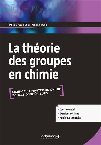La théorie des groupes est un outil indispensable en chimie. C’est une théorie mathématique très élaborée mais son utilisation en chimie ne nécessite cependant pas que l'on en connaisse tous les arcanes. Les auteurs se focalisent dans cet ouvrage sur la présentation succincte des mathématiques indispensables à la compréhension des notions exposées. L’essentiel de l’exposé est centré sur les applications de cette théorie, particulièrement pour l’établissement des orbitales moléculaires des molécules et leurs propriétés spectroscopiques. Chaque chapitre est complété par une série d’exercices.