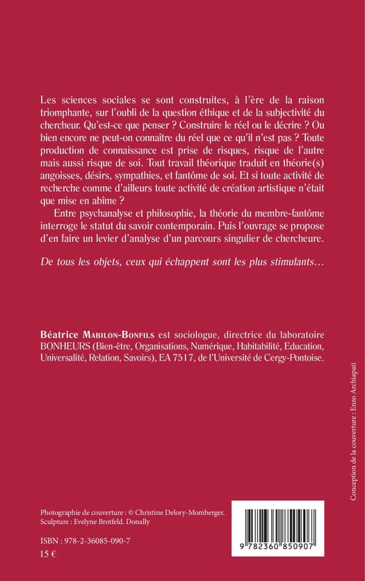 Qu'est-ce que penser ? Construire le réel ou le décrire ? Ou bien encore ne peut-on connaître du réel que ce qu'il n'est pas ? Toute production de connaissance est prise de risques, risque de l'autre mais aussi risque de soi. Tout travail théorique traduit en théorie(s) angoisses, désirs, sympathies, et fantôme de soi. Et si toute activité de recherche comme d'ailleurs toute activité de création artistique n'était que mise en abîme ? Entre psychanalyse et philosophie, la théorie du membre-fantôme interroge le statut du savoir contemporain. Puis l'ouvrage se propose d'en faire un levier d'analyse d'un parcours singulier de chercheure.
