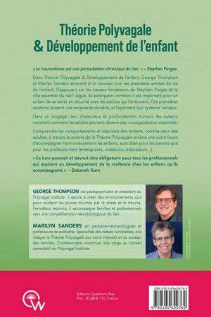 « Le traumatisme est une perturbation chronique du lien. » – Stephen Porges. Dans Théorie Polyvagale & Développement de l’enfant, George Thompson et Marilyn Sanders éclairent d’un nouveau jour les premières années de vie de l’enfant. S’appuyant sur les travaux fondateurs de Stephen Porges et le rôle essentiel du nerf vague, ils expliquent combien il est important pour un enfant de se sentir en sécurité avec les adultes qui l'entourent. Ces premières relations laissent une empreinte durable et façonnent leur système nerveux. Dans un langage clair, chaleureux et profondément humain, les auteurs montrent comment les adultes peuvent devenir des « corégulateurs » essentiels. Comprendre les comportements et réactions des enfants, comme ceux des adultes, à travers le prisme de la Théorie Polyvagale amène une autre façon d'accompagner harmonieusement les enfants, aussi bien pour les parents que pour les professionnels (enseignants, médecins, éducateurs…). « Ce livre pourrait et devrait être obligatoire pour tous les professionnels qui aspirent au développement de la résilience chez les enfants qu’ils accompagnent. »